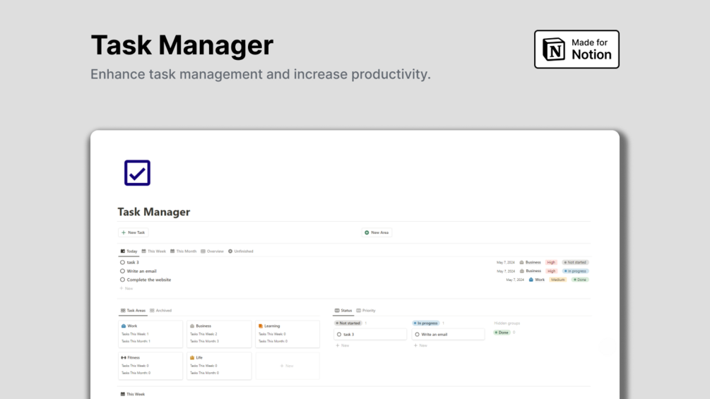 Notion Task Manager is a Notion template that helps you stay organized and manage your tasks efficiently.