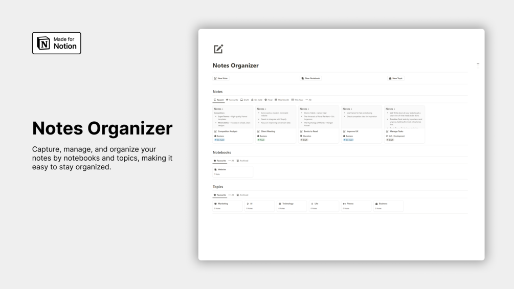 Notion Notes Organizer helps you keep all your notes in one place—without the chaos. Whether you’re taking meeting notes, brainstorming ideas, or planning your next big move, it keeps everything structured and easy to find. With three key sections—Notes, Notebooks, and Topics—you can capture information, organize it into dedicated notebooks, and categorize everything by topic for easy access.