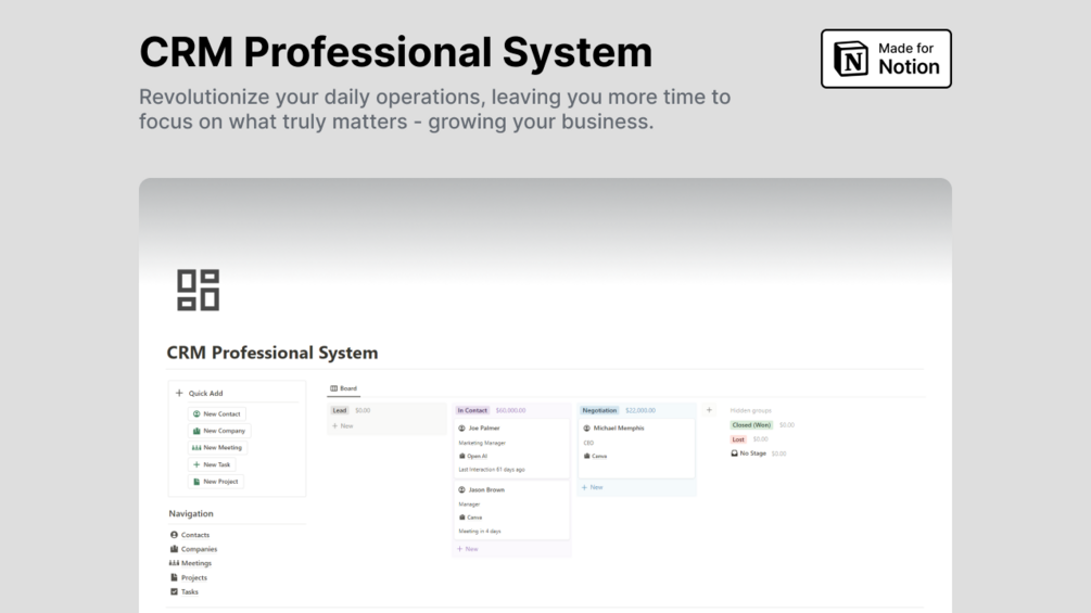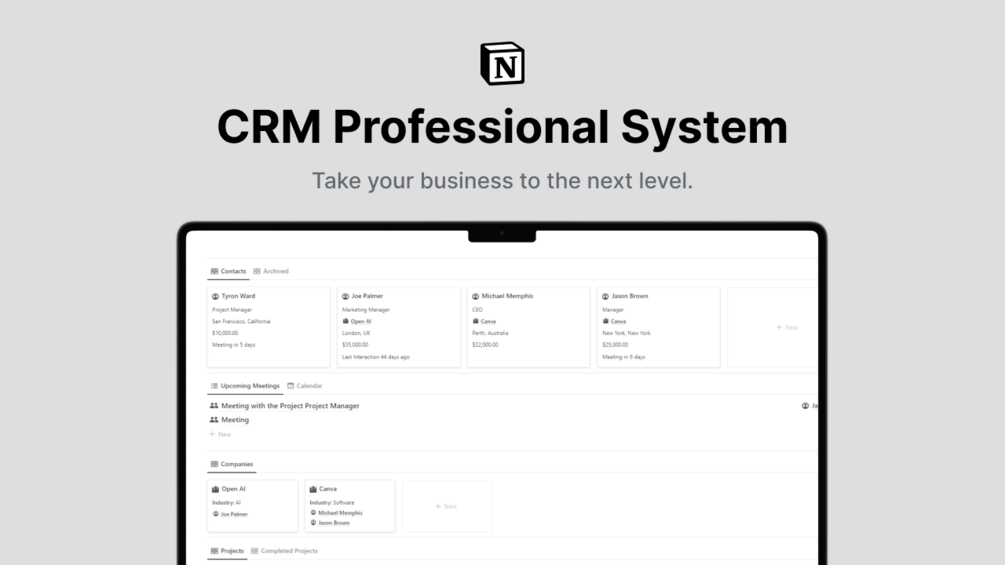 Notion CRM Professional System helps businesses organize and manage contacts, companies, meetings, projects, tasks, and much more.