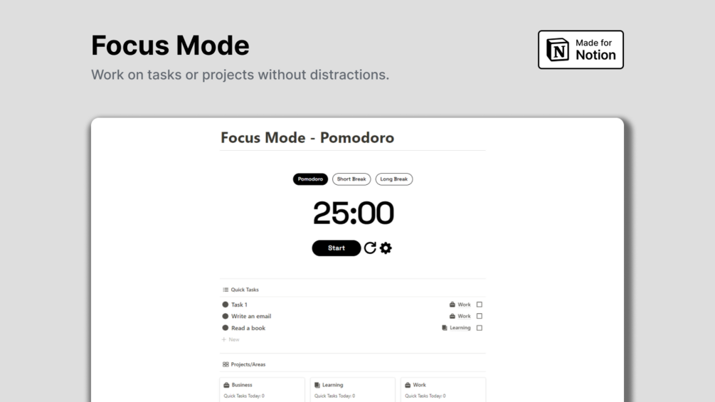 The Notion Focus Mode contains a simple task manager where you can create tasks based on projects or task areas to organize your deep work.