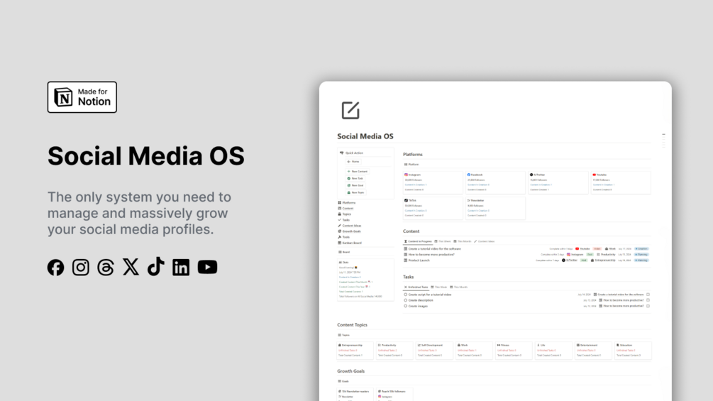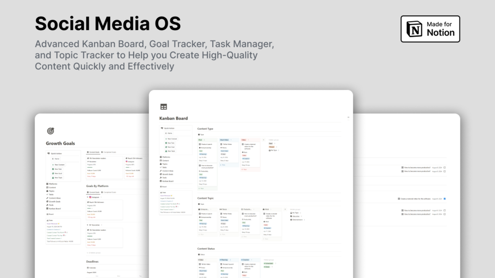 Notion Social Media OS is a Notion system to help you plan, create, and, schedule content, better manage your Social Media profiles, Track and achieve your growth goals, manage tasks related to content creation, track metrics, manage content using Kanban Board, and much more.