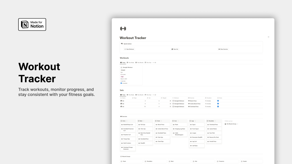 The Notion Workout Tracker is built to keep you organized, motivated, and making real progress. With four databases—Workouts, Sets, Muscle Groups, and Exercises—it provides a structured approach to training, ensuring you stay consistent and make progress over time.