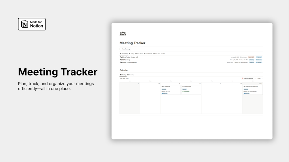 Effortlessly organize, track, and optimize meetings with this all-in-one Notion template designed to keep you and your team aligned and accountable. Whether you’re managing recurring standups, client calls, brainstorming sessions, or project reviews, this Meeting Tracker centralizes every detail to ensure everything stays on track.